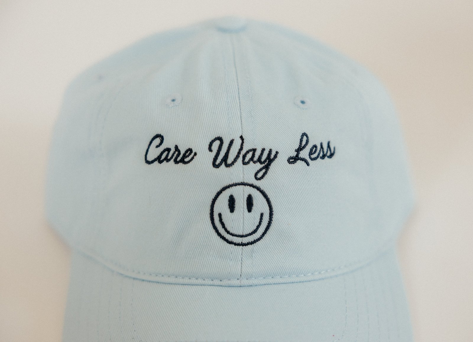 💬 Embroidered with “Care Way Less” and smiley face